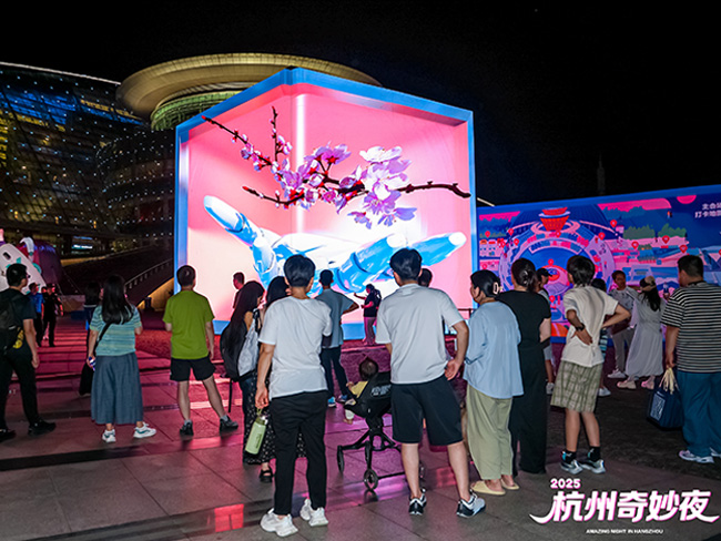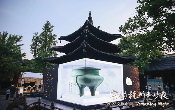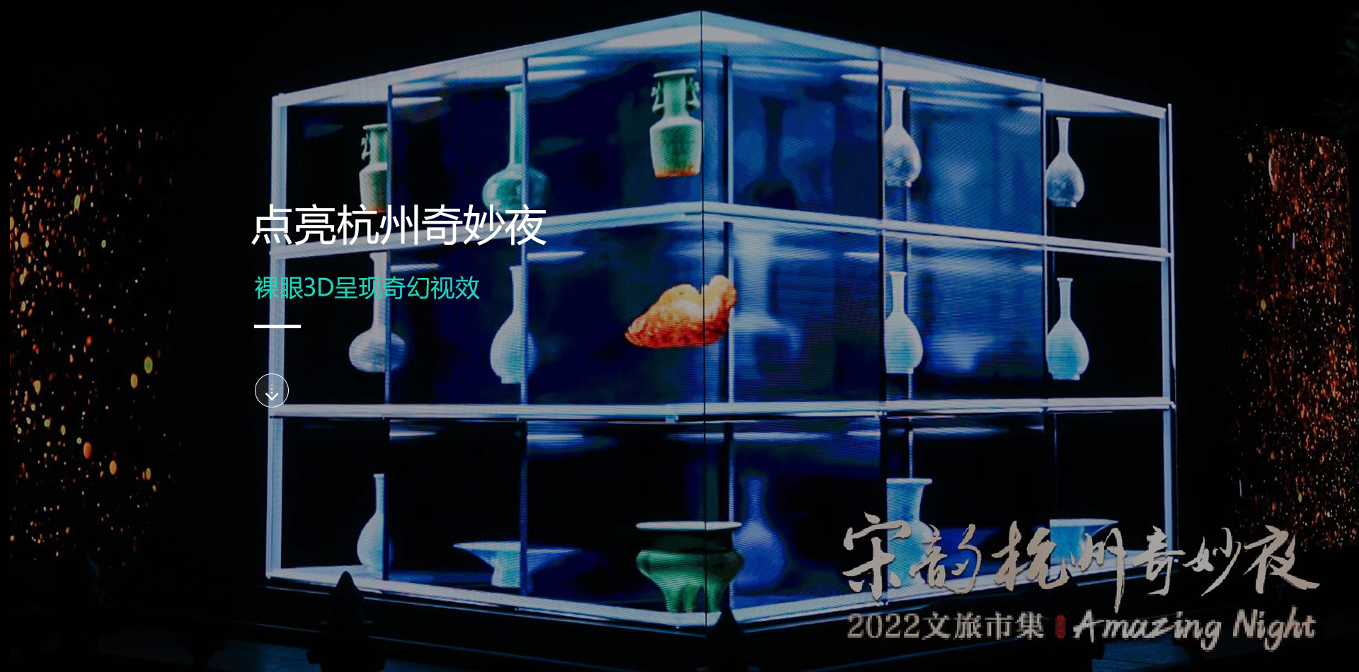天迈结合裸眼3D技术,数次为杭州奇妙夜打造点睛之笔。把杭州博物馆的经典馆藏,搬到钱王祠,让文物“活”了起来,“走”了出去。以年轻、科技、活力为基调,创意呈现数字人隔空献花的奇幻画面,实现了文化的破圈传播,提升了杭州奇妙夜的艺术表达。